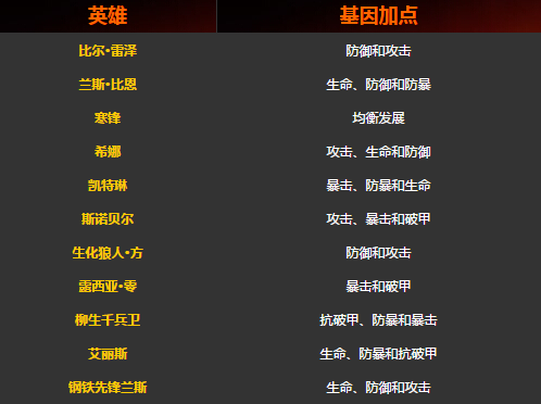 各种英雄的通用基因的加法可以参照上述的表格来添加,但是基因是对玩家所有的英雄都生效的,所以除了主加自己常用英雄的基因之外,还要为一些可能会用到的英雄加点相应的基因。当然上述基因的加法是小编的个人见解,如果你有其他的基因加点攻略,不妨放出了与大家一起分享吧。