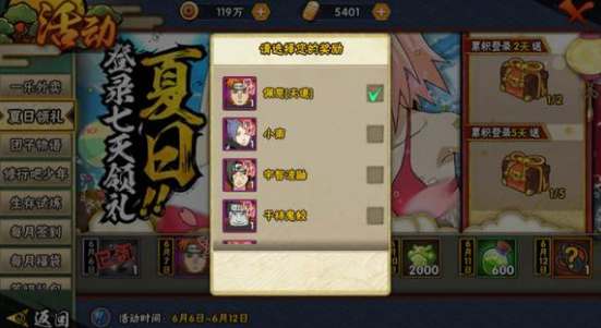 活动内容:活动期间每天登录可领取超值奖励,累积登录2天和5天还可以获得额外奖励。奖励包括:随机高级招募忍者碎片(可随机获得以下忍者的碎片:佩恩【天道】、波风水门、自来也、大蛇丸、小南、宇智波鼬、宇智波止水、迪达拉)、晓组织忍者体验卡3天(多选一)、随机传说饰品、忍界召集券、金币、保护符、随机