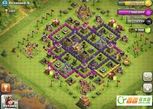实际上,这个阵型还并不是满防御状态(你可以看到我连城墙都没有刷满6本墙,还有部分5本的黄金墙,如果是满防御的状态,相信防守的效果会更好,当然也更容易被人用天龙八部强X。不过作为一个七本初期接触部落战的阵形,算是一个还不错的阵型。