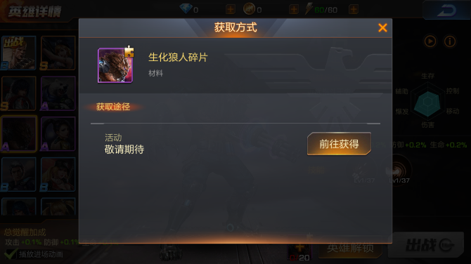 玩家通过游戏活动获得,可以获得生化狼人碎片进行合成获得英雄方。
