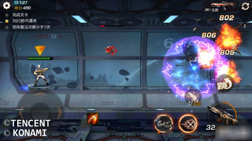 游戏的操作非常简单,左侧是虚拟摇杆,控制角色的左右移动以及下蹲上跳。右侧是行为控制面板,在战斗中对角色发出各项指令,包括射击、技能、跳跃、超级武器四个方面。指挥官需要合理的使用才能在挑战中获得不断的胜利。其中,跳跃指令可以与方向键搭配使用,例如按住向左的方向键和跳跃键,角色就会向前跃进,向下+跳跃键则是从高处下跳。