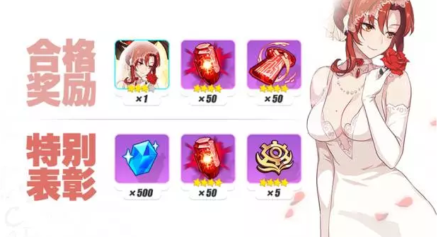 在考试中最终考试得分达到80分及以上,可获得圣痕「姬子·花嫁(中)」、稀有晶体核心×50、圣痕共鸣×50。