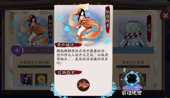 2、点击图片即可看到对应的信物线索,一般什么样式神信物有很强的代表性。比如鲤鱼精就是鲤鱼、青行灯就是灯。点击前往现世~