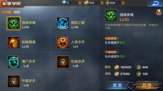 军团建筑中的军事学院是对于玩家战斗力提升来说最重要的建筑了。共计七个buff可供升级。每一项都可以大幅增加火力值,提高玩家的战斗力。前三项buff都是直接增加数值,后四项则是针对某种类型的敌人的增幅伤害,所以建议大家在资源不足的情况下,优先升级前三项增加生命值防御力和输出的buff。值得注意的是军事学院虽然消耗的军团贡献不是很多,但是升级所需的金币开支不小,请不要只顾着清点自己收获的贡献却因为缺少金币升级而欲哭无泪。