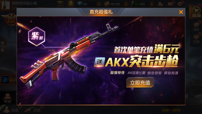 首充大礼:充值6元即送经典【紫色AKX突击步枪】