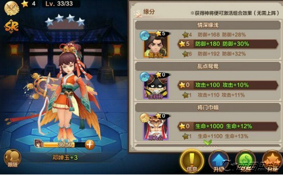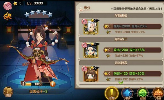 分析:技能上看是后排杀手,恐怖的伤害,驱散攻击目标增益状态高,可以用来针对敌人后排辅助,后续成长主要提升输出能力,觉醒+4以后人教伤害输出伤害提高25%,单体中SR英雄输出最强,缘分激活比较难,需要3个SSR英雄,所以前期缘分偏弱,考虑到成长空间强大所以强力推荐~