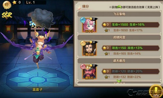 分析:阵容前排正好缺个强力防御,在其他SR英雄中间找不到更合适的,但是培养一个SSR雷震子压力少很多,慢慢来把这套阵容培养起来还是很强大的,后续成长空间也主要是防御,减伤的,缘分激活比较简单,除了一个还没有开放的SSR英雄都可以轻松激活,雷震子目前也是最强防御英雄,值得培养