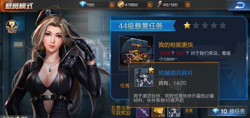 2、机械哨兵伙伴则是在悬赏模式中获得,完成5星级悬赏任务,可以获得2个机械哨兵碎片,集齐20个碎片之后就可以获得机械哨兵了。