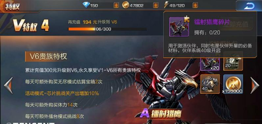 3、镭射猎鹰伙伴则是在V6特权礼包中获得,这个伙伴还是相当不错的,伤害高,而且技能也很给力。