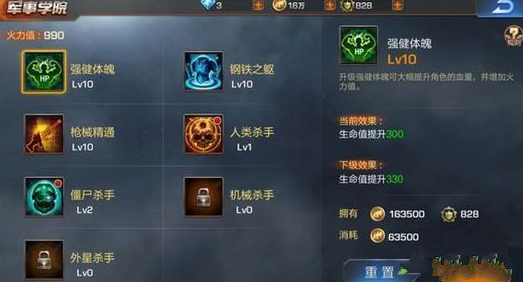 魂斗罗归来中军事学院玩法中目前有几个技能,不同技能属性加成不同,玩家也可以按照自己的理解加点。