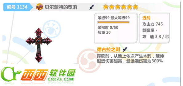 本体攻击是范围不大的近战伤害,在攻击的同时,会向前方发出多发逐渐变大,伤害也逐渐变高的尖刺,第一个尖刺745伤害(最低值),最后一个尖刺2235伤害(最高值)。尖刺对部分敌人有击退的效果,每个敌人也可以受到多次尖刺的攻击,不过,尖刺伤害不是近战伤害,不会被嗜血之刃和近战使魔加成,而尖刺的命中难度也很高,使用起来并不舒服。