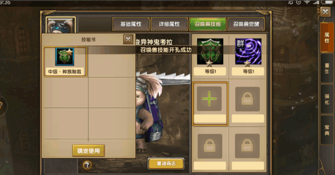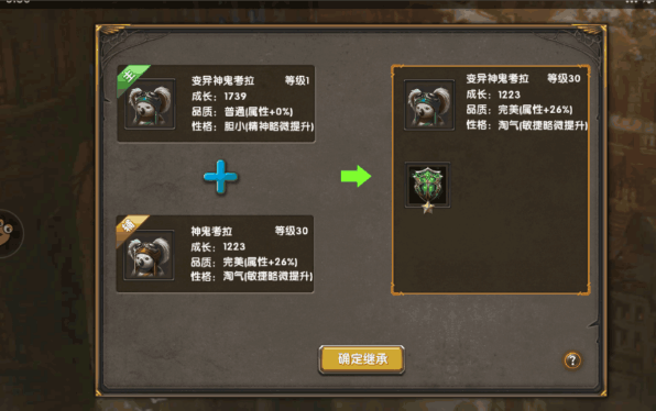 召唤兽的继承系统,可以选择把原来宠物的技能、成长以及等级继承到变异兽上。如下图。