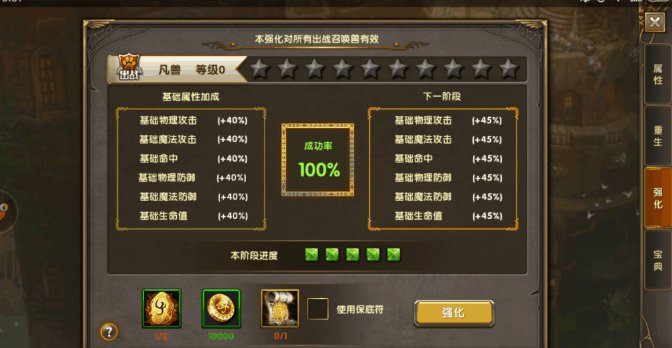 在获取适合自己的召唤兽的同时,别忘记了强化,如下图,这个没什么技巧,按照系统提示操作即可,正中央的成功率代表着强化成功的几率,如果成功率高,那就搏一搏,假如成功率低于50%,那就可选择保底符,保底符可在强化10星以内使用。