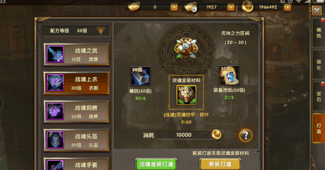 装备可以在铸造界面打造紫装和灵魂金装。前期可以先穿戴一整套紫装,等在首领、公会试炼中获取足够的金装材料之后,再慢慢的替换身上的装备。