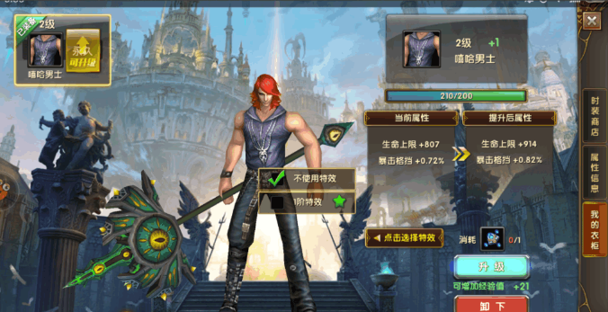 时装可以通过消耗奇幻时装能量石来升级,而且可以选择特效,如下图。这里简要一提。