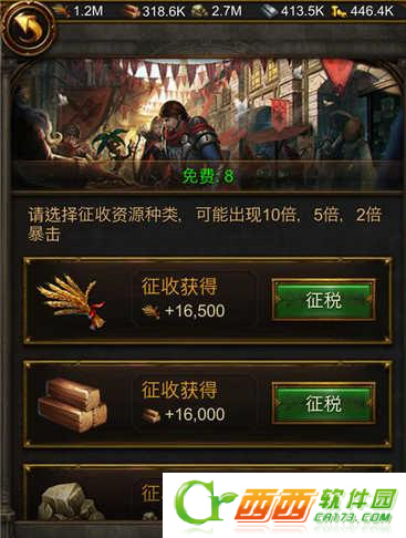 市场:每天的资源征税是不能错过的资源收入,免费次数用完后,10钻石以下的征收也是不错的。黑市每隔一段时间就会刷新全部物品,每次刷新都值得一看是否有东西值得购买。