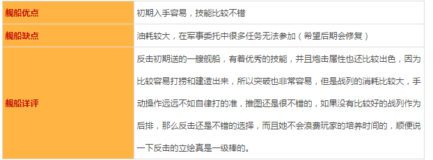 推图还是很不错的,如果没有比较好的战列作为后排,那么反击还是不错的选择,而且她不会浪费玩家的培养时间的,顺便说一下反击的立绘真是一级棒的。 反击初期送的一艘舰船,有着优秀的技能,并且炮击属性也还比较出色,因为比较容易打捞和建造出来,所以突破也非常容易,但是战列的消耗比较大,手动操作远远不如自律打的准。