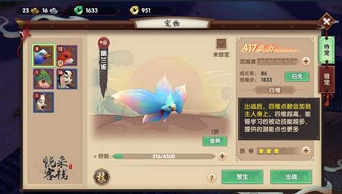 在宠物出战后,宠物的四维会附加在主人身上为主人提高属性,而四维点数越高提升主人的属性也就越高,并且还能让宠物学习到更强大的技能。而在宠物技能中,大多数技能也是需要许多的四维资质需求,只有四维达到一定的点数,才能够学习这些技能。侍宠的技能分为“攻击”“防御”“四维”“融合”四大类,攻击类别中,就是为了提升攻击系的六个属性,物理法术攻击、物理法术穿透、会心率及会心伤害,需要的四维前置也通常是元神或者力量。防御则是提高各种抗性以及生命值,需要的四维前置则通常是体魄筋骨。四维则顾名思义,增加四属性,通常需要对应的属性为前置,而融合则是增加大多数属性,通常会需要四个属性都打到6才可以学习。骑宠的技能其实相比侍宠要相差很多,但分类是相同的,并且骑宠技能增加的属性偏向综合,在实际的战斗中相对实用一些。并且骑宠还有一个主动技能可以学习。当骑宠四维大于16星时,骑宠可获得第一个技能,而当骑宠技能总和达到32星时,便可以学习第二个宠物主动技能,第二个主动技能是第一个的升级版,效果要比第一个技能强势不少呢。