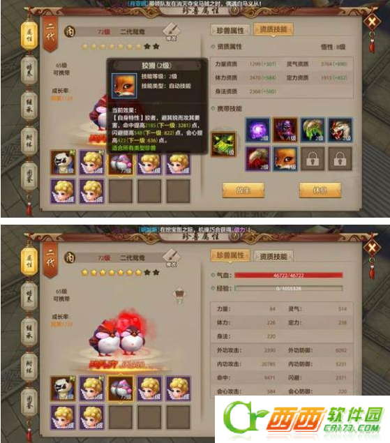 我觉得狡猾一定要占一个位置,技能效果如下图。狡猾技能没有生效的属性我也贴出来了。2100的命中,加强了近四分之一,400多的会心更是成倍加强。对宝宝的加成就不用我多说了吧。这还只是2级效果,更重要的是狡猾还便宜。