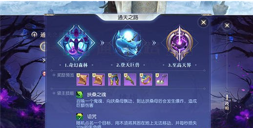 通天之路副本共有“奇幻森林”、 “登天巨兽和“至高天界”3个关卡及英雄、史诗、传说三个难度可供选择。目前开放的只有第一个关卡“奇幻森林”,传说难度也暂未开放,史诗难度需要玩家通关英雄难度(击败普通难度全部领主)并且达到70级才能挑战。