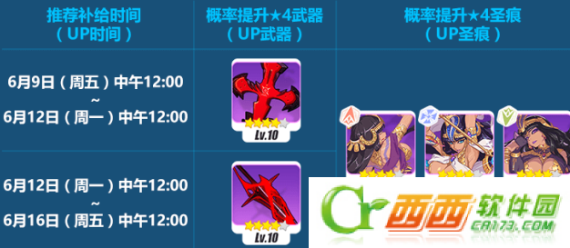此外,★4武器「能量跃迁者」「虚无之刃」「牛鬼切·长光」等、★4圣痕「浓姬」「塞西莉亚·沙尼亚特」等也可以通过本期补给获得。其中武器「仿犹大·血之拥抱」、「鲜血之舞」与圣痕「克列欧博克拉」均有获取概率相对更高的推荐补给时间。