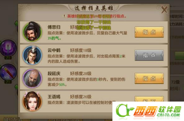 技能指点效果选择的话,游戏前期可以使用傅思归,可以回复一些蓝量。在获得了其他指点英雄后,PVE方面是段延庆,可以减伤,PVP方面就是王语嫣,特别是被天山和逍遥职业定身的情况下,