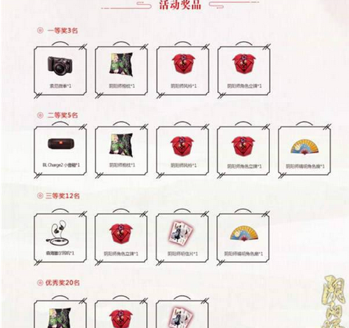 活动奖励丰富,有微单相机、阴阳师抱枕、音响、耳机、明信片等众多周边。