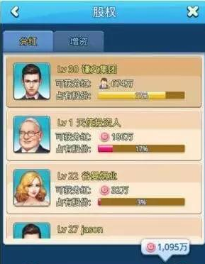 在《大富豪3》通过公司分红可获得个人财富,如果您有投资别家企业,那么个人财富就可以用来增资,稀释其他股东的股权,从而扩大自家的占股。但由于在游戏内增资的信息也将同步给同一企业的其他投资人,如果有其他投资人也发起增资,最后的结果很有可能会大家占股比例维持现状,所以增资需谨慎考虑喔。