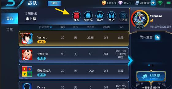 每天都可以为战队成员发红包,同时也可以自己抢红包,不过有限制条件:近两天活跃度至少有一天达到120才允许发红包,每个红包最多188钻石,可以分为十份发出去,玩家每天只能发一次红包,另外抢红包的上限是100钻石