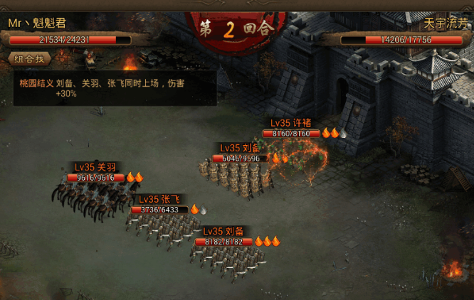 【组合技能】桃园结义:刘备、关羽、张飞同时上场,伤害+30%