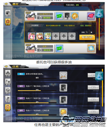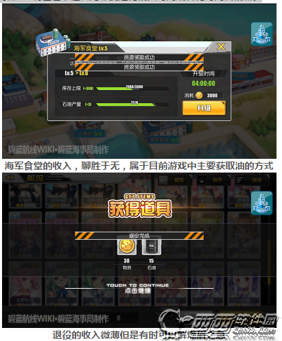 油的收入可以从学院内的海军食堂,委托,退役船只,任务等地方获得,虽然获得的油只是杯水车薪,但是聊胜于无,有些委托和任务给的油还是比较充足的,至少能供你的主力队伍完整的推完一张图,完全靠食堂可是完全不够用的哟,至于等待的时间嘛……现在这个社会无非就是花钱买时间或者花时间省钱嘛。
