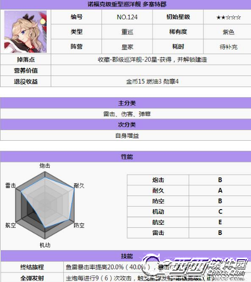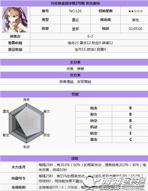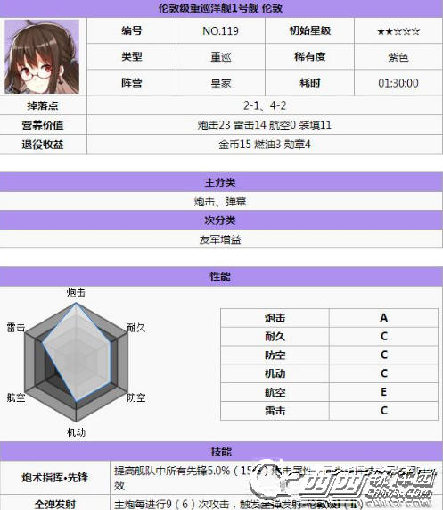 紫色稀有度,属性除了炮击都低于埃克塞特一级,但是技能提供了15%的炮击属性加成,属于炮击能力MAX的类型,如果前排缺少输出可以选择。