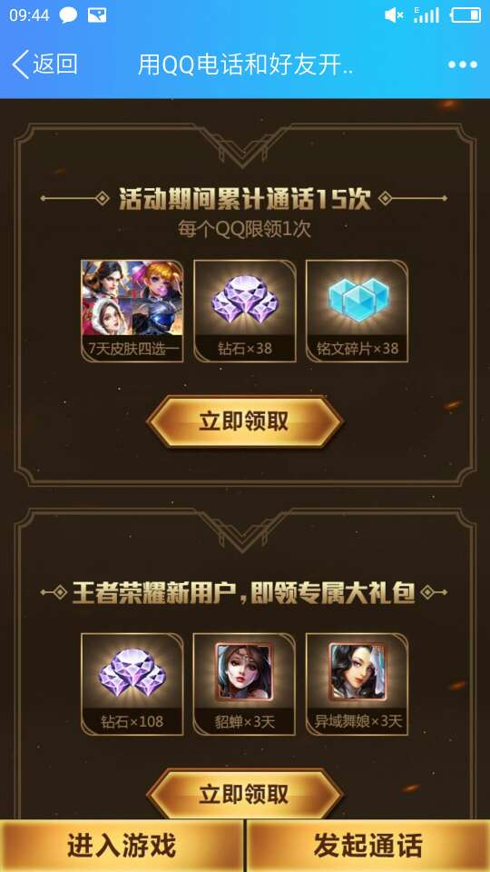 王者荣耀玩家每日用QQ电话累积3次,每次通话至少3分钟就可以领取钻石18*和铭文碎片*38。