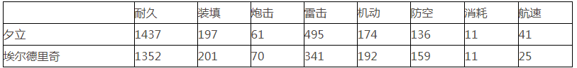 两艘驱逐舰耐久、雷击、航速夕立更高,装填、炮击、机动、防空埃尔德里奇更高。