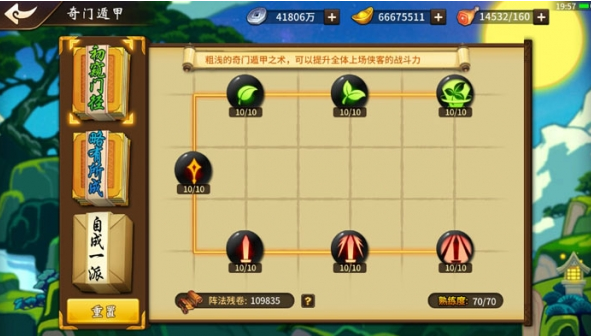 奇门遁甲分为初窥门径、略有所成、自成一派三个境界,由浅入深,学习需要消耗一定的银两和阵法残卷。初窥门径境界主要针对的是上阵侠客的气血和攻击力两个方面;略有所成境界则是针对前后排的侠客进行不同的加强;自成一派境界细化到针对不同类型侠客的属性提升。