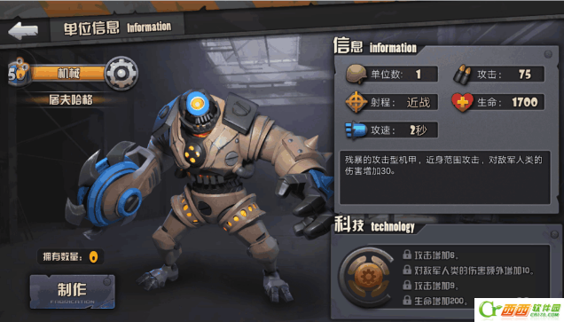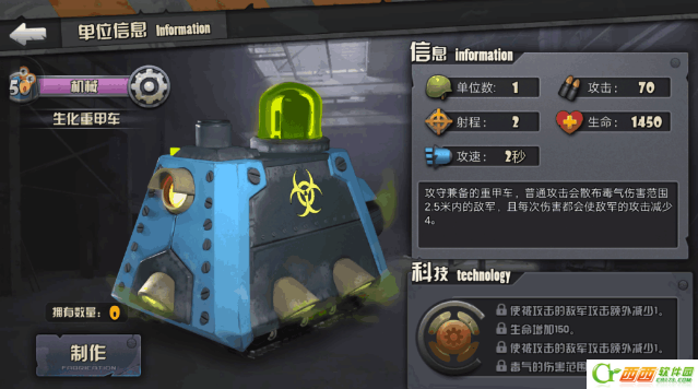【生化重甲车】近战兵的克星,攻击力也非常高,还是范围伤害,而且每攻击一次,使对方伤害降低4,科技3级能达到6,不错的一张卡