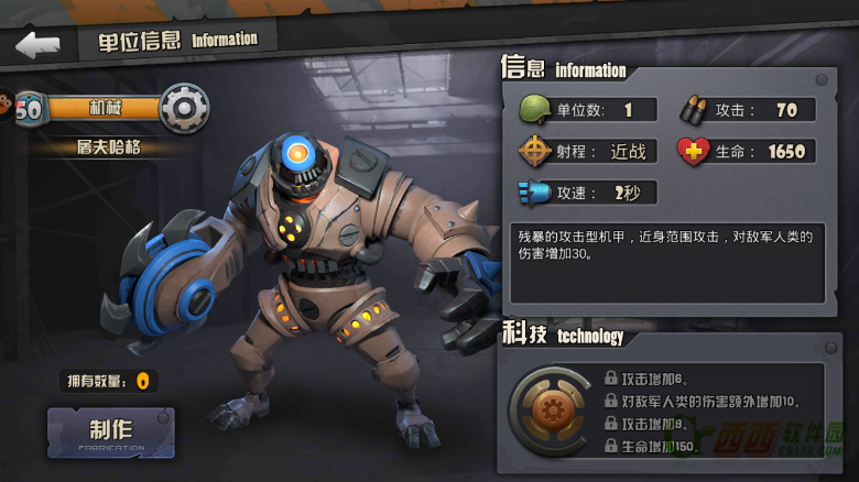 残暴的攻击型机甲,近身范围攻击,对敌军人类的伤害增加30