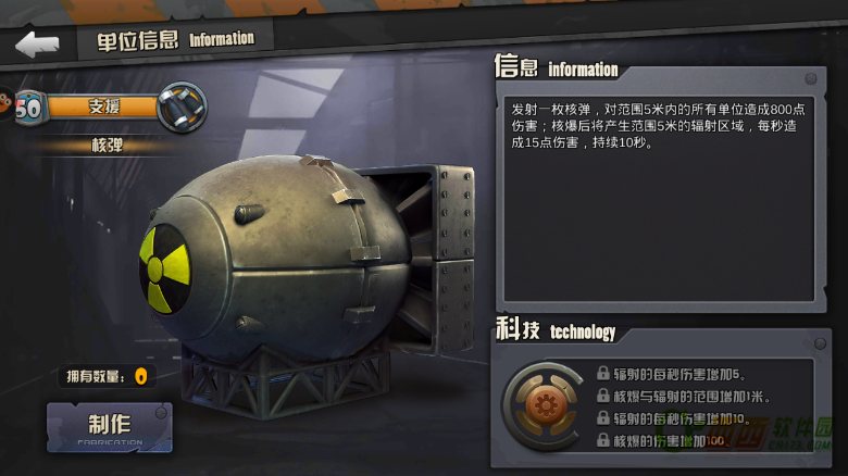 发射一枚核弹,对范围5米内的所有单位造成900点伤害;核爆后将产生范围5米的辐射区域,每秒造成15点伤害,持续10秒