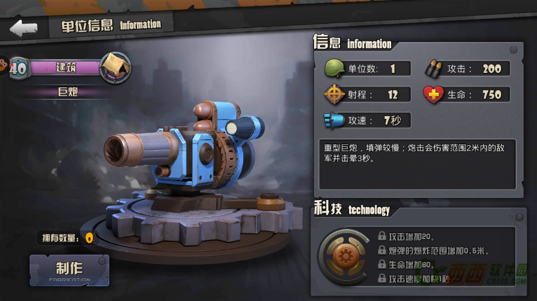重型巨炮,填弹较慢;炮击会伤害范围2米内的敌军并击晕3秒