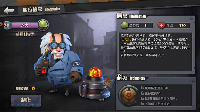 [出战]:进行核爆试验,50%几率引发一次核爆炸,对范围5米内所有单位造成600点伤害;核爆后,将产生范围5米的辐射区域,每秒15点伤害,持续10秒 若核爆试验失败,则科学家死亡