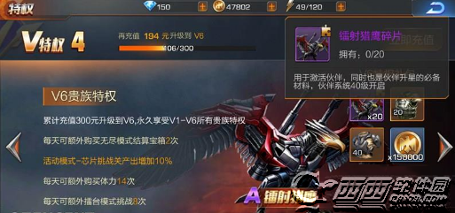 3、镭射猎鹰伙伴则是在V6特权礼包中获得,这个伙伴还是相当不错的,伤害高,而且技能也很给力。