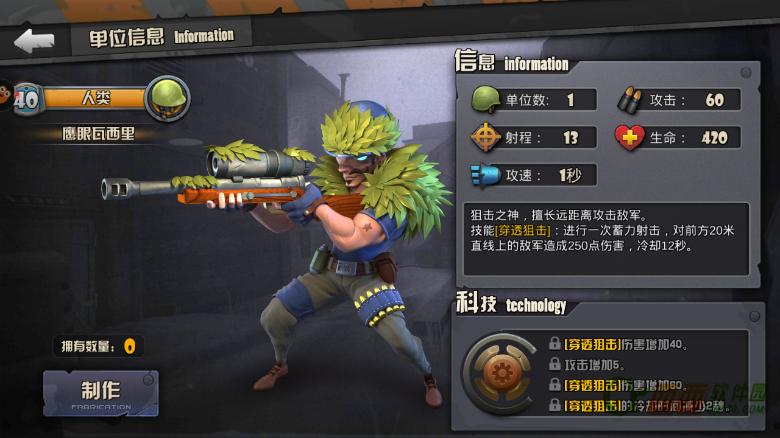 [穿透狙击]:进行一次蓄力射击,对前方20米直线上的敌军造成250点伤害,冷却12秒