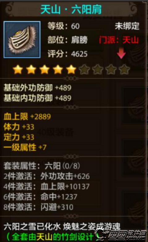 抗性,可以选择火抗,玄抗。可以减少受到逍遥和峨眉两个远程职业的伤害。下图中的装备,再增加一条血上限属性,防御换成体力属性,身法换成力量属性就是天山职业的完美极品装备了。