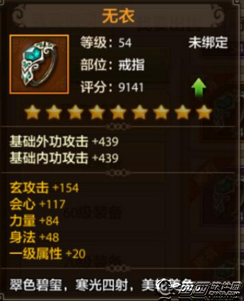 所有属性,身法为最佳完美属性。下图中,玄攻击属性换成毒攻击,会心换成,体力,再增加一条外功攻击属性,就是丐帮的最佳极品装备属性。