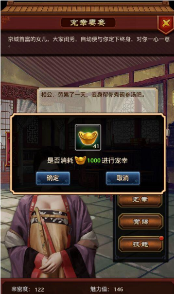 亲密度有一个坑就是亲密度越高,你宠幸她所花费的元宝就越多。虽然宠幸生孩子的概率比随机传唤的概率大,但是为了元宝考虑,后期就只能随机传唤了。