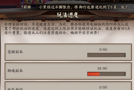 阴阳师电脑版玩法进度限制玩家游戏,进度达到上限后将不能继续该玩法,进度条每日0点进行重置