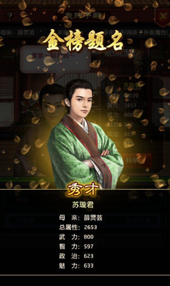 孩子的资质、子嗣的等级分为笨拙、平庸、聪慧、睿智和神童,依次对应10、20、30、40和50的等级。等级升满了之后可进行科举。科举之后可依照属性划分为童生、秀才、举人、进士、探花、榜眼和状元。等级越高越难培养。所以并不是属性越高就越好。只有达到相应等级才能长大成人,而且只有同等资质的双方才能联姻,所以说孩子资质越高就越难养,会花费的东西就越多。因人而异吧。并且,50级不一定就是状元。也有可能是榜眼。子嗣的资质都由母亲的亲密度决定。亲密度越高子嗣的资质就越高。母亲的亲密值可以通过赠送心心来增加。寻访也有一定几率可以增加,但是会比较少。如果是氪金玩家可以在充值奖励或者商场活动里获得心心。平民玩家的话还是老老实实攒心心吧 。在牢房里。惩罚黄四可以获得心心或者簪子这些道具。如果名望产出不对的话建议攒一天名望再去惩罚以确保可以惩罚到想惩罚的犯人哦!子嗣的位置可以扩建,到达5个之后可以解锁一键培养,会方便许多。培养子嗣会有一定几率触发天资聪慧。(亲测晚上0点—1点触发几率高哦)
