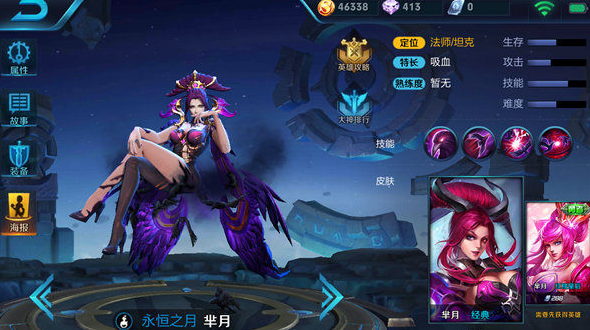 大招【暗影之月】:芈月遁入黑暗能量,增加自身移动速度并免疫所有效果持续2秒,技能开启及结束时都将对范围内的敌人造成法术伤害,如果第二段伤害命中敌人,则为芈月召唤一个暗影仆从;被动:芈月普通攻击得到强化,造成法术伤害与减速效果,同时增加自身暗影之力。