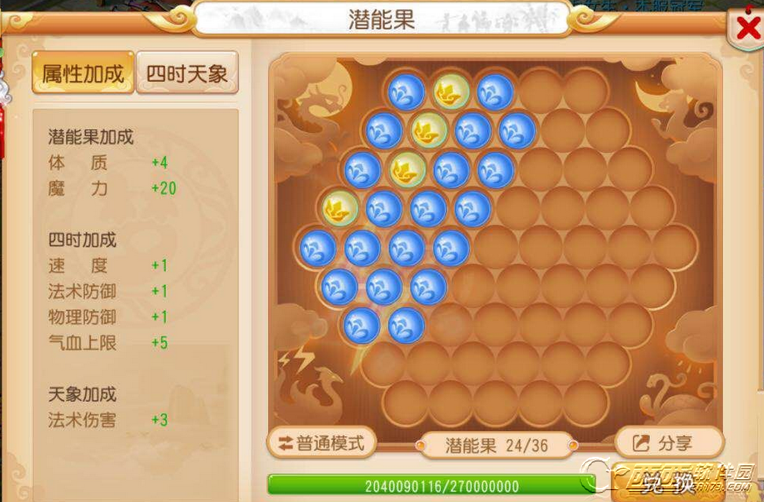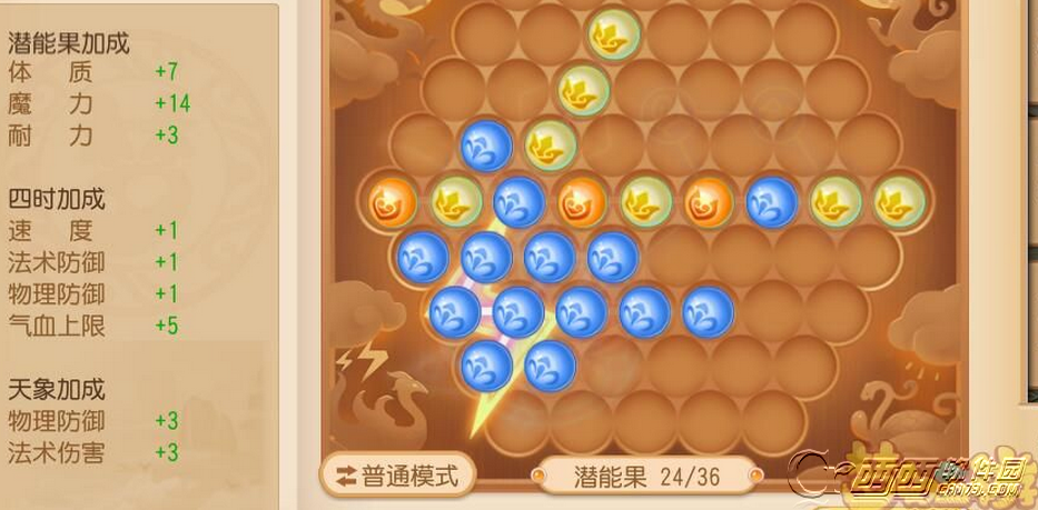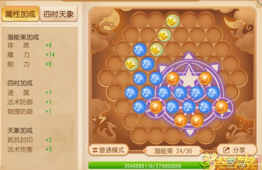 方案一:只保留四时属性及一个彗星袭月的天象属性暴力组合。20颗魔力4颗体质,天象属性加成法术伤害。在感觉不是很需要其他属性辅助的情况下,这个排列组合相对来说输出最大化吧。