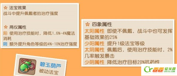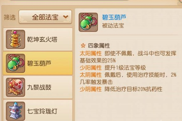 从法宝效果上来看,提高治疗效果。葫芦会是普陀以及地府两个辅助门派的必备,提升一级可以提高2%的治疗强度,最高为20%,按照90普陀平均350的治疗强度来测算,一灯可以多加到80~100血,每回合回血量也略有提升,还是非常实用的一件法宝。